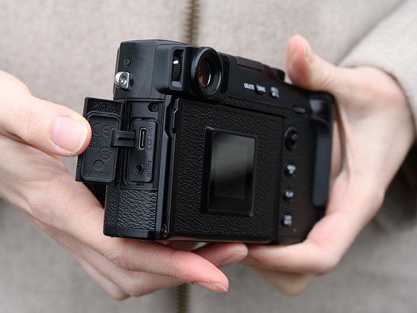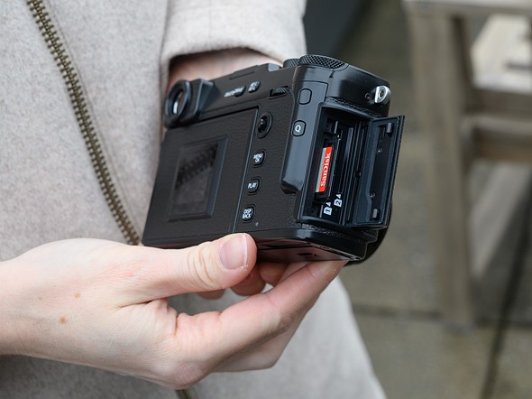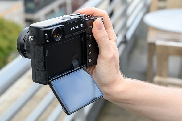 มาที่ด้านหลังของกล้องซึ่งนับว่าเป็นจุดขายของรุ่นนี้เลยคือหน้าจอที่ถูกซ่อนขนาด 3 นิ้ว ความละเอียด 1.62 พิกเซล สามารถกางออกมาได้ 180 องศารองรับการสัมผัส และเมื่อพับหน้าจอขนาดใหญ่เข้าไปแล้วจะมีหน้าจอเล็กๆ ที่คอยแสดงผลการตั้งค่ากล้องที่สำคัญๆ ได้แก่ white balance, film simulation, และ ISO ใช้การออกแบบแบบนี้เพื่อขจัดหน้าจอขนาดใหญ่ซึ่งเป็นสิ่งรบกวนขระถ่ายภาพ – Fujifilm