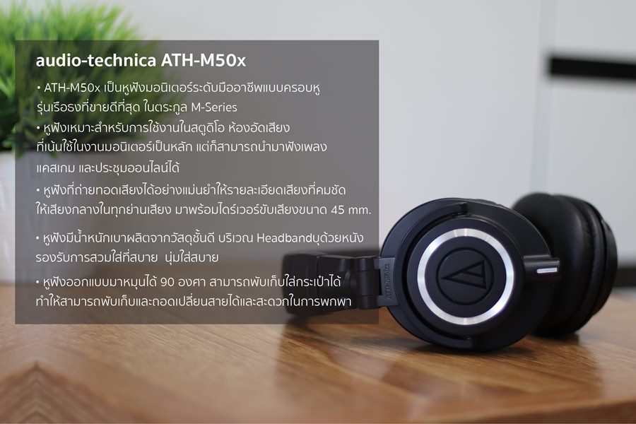 สำหรับ ATH-M50x เป็นหูฟังมอนิเตอร์ระดับมืออาชีพแบบครอบหู รุ่นเรือธงที่ขายดีที่สุดในตระกูล M-Series ของAudio-Technica หูฟังที่ถ่ายทอดเสียงได้อย่างแม่นยำให้รายละเอียดเสียงที่คมชัดให้เสียงกลางในทุกย่านเสียงอีกทั้งตัวหูฟังมีน้ำหนักเบา