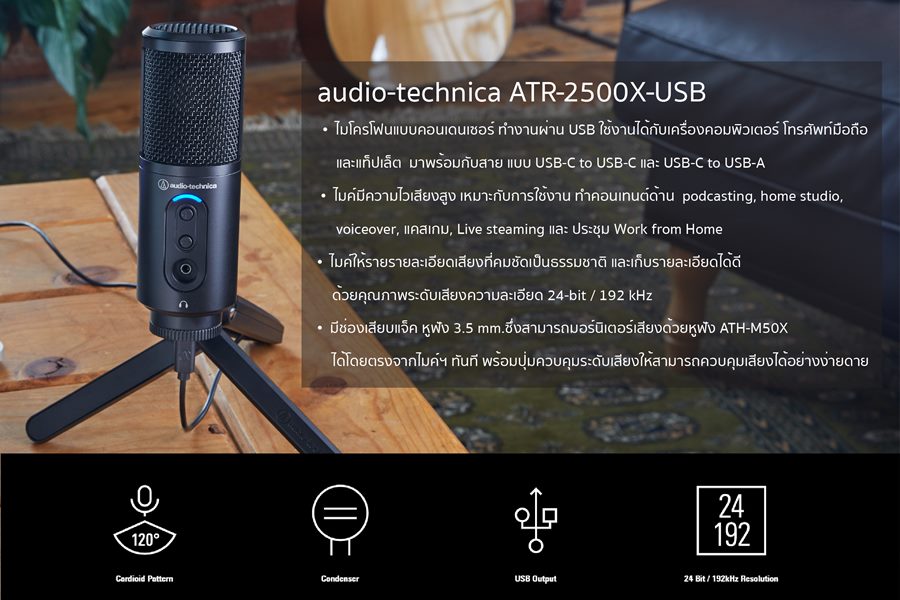 ในขณะที่ ATR2500X-USB เป็นไมโครโฟนแบบคอนเดนเซอร์ (Condenser Microphone) ซึ่งไมโครโฟนชนิดนี้ทำงานผ่าน USB ในรูปแบบ Plug and Play และมีความไวเสียงสูง เหมาะกับการใช้งานด้าน podcasting, home studio recording, voiceover, แคสเกม, Live steamingและยังสามารถใช้ในการทำคอนเทนต์หรือ แม้กระทั่งการประชุมงานในช่วง Work from Home ได้อีกด้วย โดยเสียงที่ได้คมชัดเป็นธรรมชาติ และเก็บรายละเอียดได้ดี