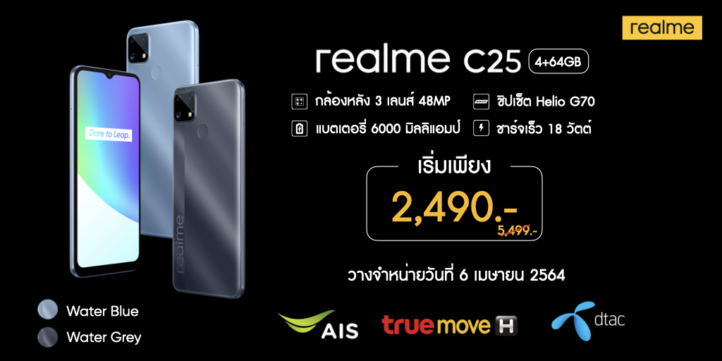realme C25 ‘กล้อง 48MP แบต 6000 mAh’ ความจุ 4+64GB มาพร้อมกับกล้องหลัง 3 เลนส์ ความละเอียด 48 ล้านพิกเซล ชิปเซ็ตเกมมิ่ง Helio G70 แบตเตอรี่ 6000 มิลลิแอมป์ พร้อมชาร์จเร็ว 18 วัตถ์ มาในราคาเพียง 5,499 บาท วางจำหน่ายในวันที่ 6 เมษายน ที่ realme Brand Shop และตัวแทนจำหน่ายทั่วประเทศ