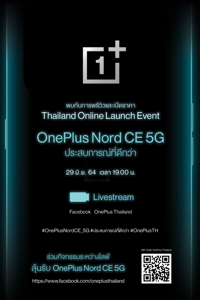 ซึ่งงานจะจัดงานเปิดตัวสมาร์ทโฟน OnePlus Nord CE 5G Online Launch Event ในไทยอย่างเป็นทางการในวันที่ 29 มิถุนายน 2564 เวลา 19.00 น. ผ่านทาง Facebook Fanpage: OnePlus Thailand >>> https://www.facebook.com/oneplusthailand/