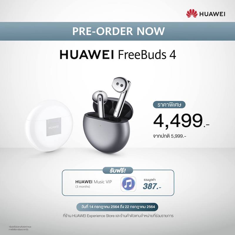 พิเศษสำหรับช่วง Pre-order ระหว่างวันที่ 14 กรกฎาคม 2564 ถึง 22 กรกฎาคม 2564 สามารถเป็นเจ้าของ HUAWEI FreeBuds 4 ได้ในราคาเพียง 4,499 บาท (จากราคาปกติ 5,999 บาท) พร้อมรับฟรีบริการ HUAWEI Music VIP นาน 3 เดือน รวมมูลค่า 387 บาท เมื่อสั่งซื้อผลิตภัณฑ์ได้ที่หน้าร้าน HUAWEI Experience Store และร้านค้าตัวแทนจำหน่ายที่ร่วมรายการ โดยสามารถอ่านรายละเอียดเพิ่มเติมเกี่ยวกับผลิตภัณฑ์ได้ที่นี่ หรือสั่งซื้อผ่านช่องทางออนไลน์ได้ที่ HUAWEI Online Store , Shopee, Lazada และ JD Central