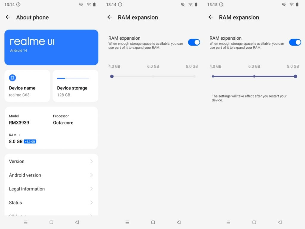 นอกจากนี้ realme ยังได้พัฒนาเทคโนโลยี DRE ซึ่งแปลง ROM เป็น RAM เสมือนเพื่อขยาย RAM realme C63 สามารถขยาย RAM 8GB ได้สูงสุด 8GB เพื่อเพลิดเพลินกับประสบการณ์ขนาด 16GB