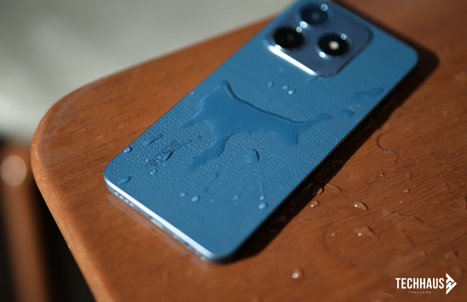 ด้านหลังของตัวเครื่องเราจะเห็นโมดูลกล้องรูปทรงสี่เหลี่นมเลนส์เดโคที่มีเอกลักษณ์เฉพาะตัวในช่วงราคานี้มีราคาสูงกว่า แข็งแรงกว่า และมีพื้นผิวที่แข็งแรงกว่า สีฟ้าอโนไดซ์กลมกลืนกับสีหนังธรรมดาช่วยเพิ่มเสน่ห์ให้กับฝาหลัง
