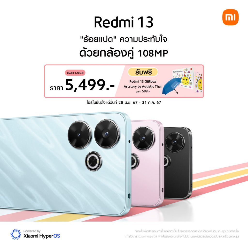 - ลูกค้าที่ซื้อ Redmi 13 ระหว่างวันที่ 28 มิถุนายน – 31 กรกฎาคม 2567 จะได้รับ Redmi 13 Giftbox Artstory by Autistic Thai มูลค่า 599 บาท ฟรี