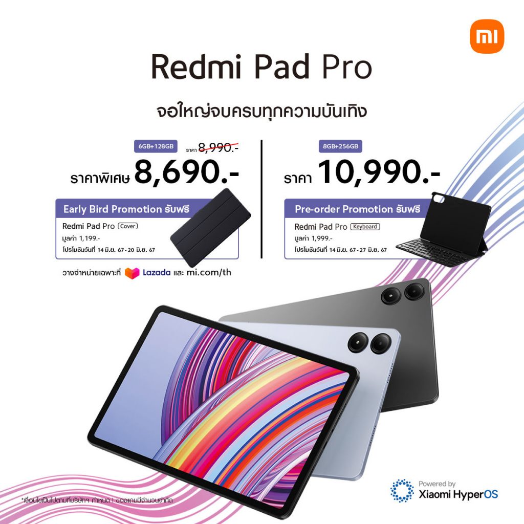 - ลูกค้าที่ซื้อ Redmi Pad Pro รุ่น 6GB+128GB ระหว่างวันที่ 14-20 มิถุนายน 2567 จะได้รับส่วนลดพิเศษและ Redmi Pad Pro Cover มูลค่า 1,199 บาท ฟรี