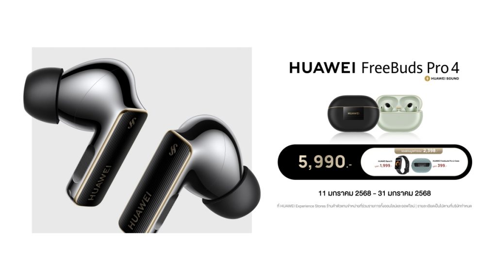 HUAWEI FreeBuds Pro 4 วางจำหน่ายในราคา 5,990 บาท โปรโมชันเมื่อสั่งซื้อตั้งแต่วันที่ 11 มกราคม 2568 – 31 มกราคม 2568 รับฟรีทันทีของสมนาคุณมูลค่ารวม 2,398 บาท ได้แก่ HUAWEI Band 9 มูลค่า 1,999 บาท และ HUAWEI FreeBuds Pro 4 Case มูลค่า 399 บาท ที่ HUAWEI Experience Storeและร้านค้าที่ร่วมรายการ รวมทั้งช่องทางออนไลน์ HUAWEI Store และร้านค้าอย่างเป็นทางการของหัวเว่ยบนแพลตฟอร์ม Lazada, Shopee, และ TikTok Shop