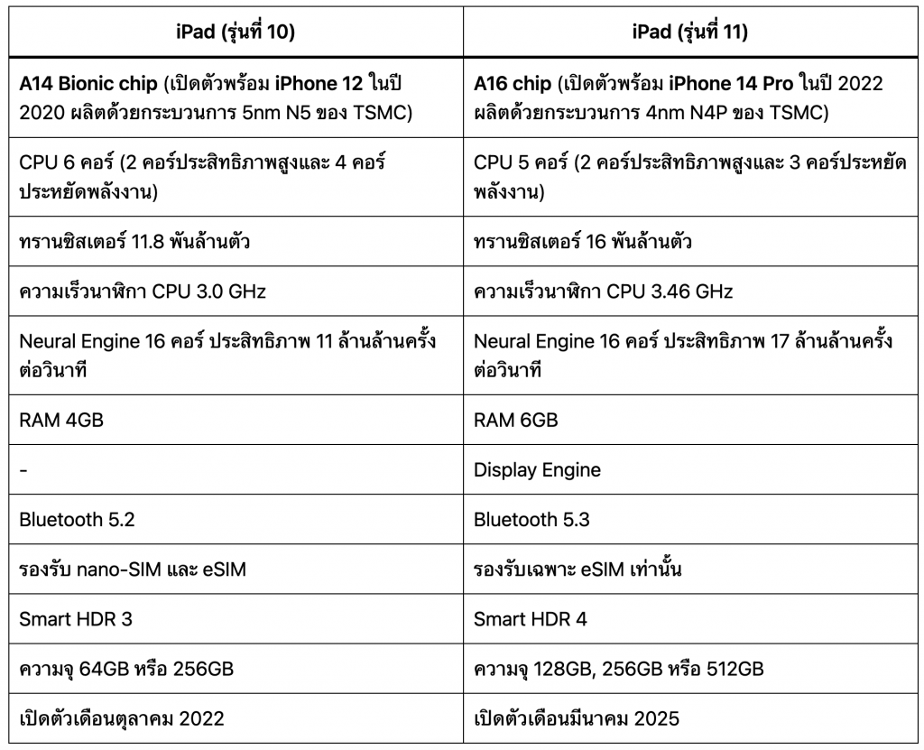 iPad รุ่นที่ 11 มาพร้อมการอัปเกรดหลายจุดที่น่าสนใจเมื่อเทียบกับรุ่นที่ 10 โดยยังคงราคาเริ่มต้นที่ 11,900 บาท แต่เพิ่มความจุพื้นฐานเป็นสองเท่า นับเป็นการปรับปรุงที่คุ้มค่าสำหรับผู้ใช้ทั่วไป ทีมข่าวได้รวบรวมความแตกต่างสำคัญระหว่างสองรุ่นนี้ดังนี้