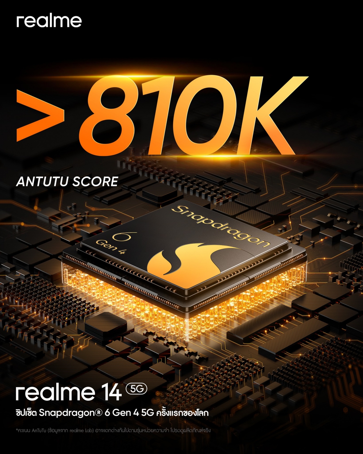 ด้วยพลังของชิปเซ็ตใหม่นี้ ทำให้ realme 14 5G ได้เขียนประวัติศาสตร์หน้าใหม่ด้วยการเป็นสมาร์ทโฟนเครื่องแรกของโลกที่ติดตั้งชิปเซ็ต Snapdragon 6 Gen 4 ซึ่งพิสูจน์ตัวเองด้วยคะแนน AnTuTu ที่ทะลุ 810,000 คะแนน!