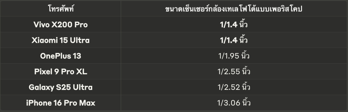 ตารางอ้างอิงข้างต้นแสดงให้เห็นความแตกต่างของขนาดเซ็นเซอร์อย่างชัดเจน สมาร์ทโฟนเรือธงอย่าง iPhone 16 Pro Max และ Galaxy S25 Ultra ใช้เซ็นเซอร์ที่มีขนาดเล็กกว่าครึ่งเมื่อเทียบกับสิ่งที่คุณได้รับใน Vivo X200 Pro หรือ Xiaomi 15 Ultra