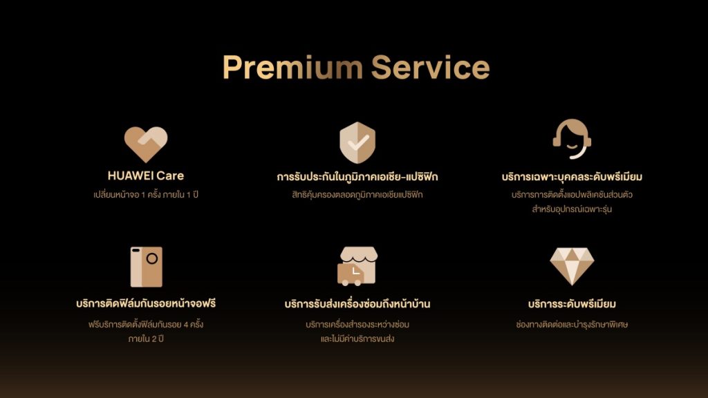 นอกจากนี้ ลูกค้ายังจะได้รับบริการพรีเมียมที่ครอบคลุมทั้ง HUAWEI Care บริการเปลี่ยนหน้าจอ 1 ครั้ง ภายใน 1 ปี, การรับประกันในภูมิภาคเอเชียแปซิฟิก, บริการติดตั้งแอปพลิเคชันส่วนตัว, บริการติดฟิล์มกันรอยหน้าจอฟรี 4 ครั้งภายใน 2 ปี, บริการรับ-ส่งเครื่องซ่อมถึงหน้าบ้าน และบริการเครื่องสำรองระหว่างซ่อม