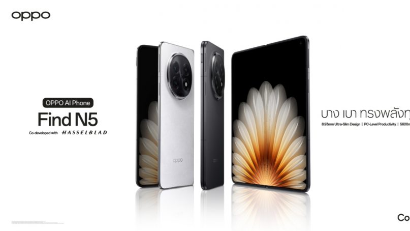 ออปโป้ ไทยแลนด์ ผู้นำตลาดสมาร์ตโฟนในประเทศไทย เดินหน้ายกระดับนวัตกรรมสมาร์ตโฟนจอพับ เปิดตัว “OPPO Find N5” รุ่นใหม่ล่าสุด ภายใต้แนวคิด ‘บาง เบา ทรงพลังทุกมิติ’ โดดเด่นด้วยดีไซน์บางเพียง 8.93 มิลลิเมตร พร้อมรอยพับจอที่แทบมองไม่เห็น ผสานประสิทธิภาพการทำงานระดับ PC รองรับการทำงานแบบมัลติทาสก์ มาพร้อมผู้ช่วย AI อัจฉริยะและการเชื่อมต่อระบบ Mac จากระยะไกลที่ลื่นไหล เสริมทัพด้วย OPPO Watch X2 สมาร์ตวอตช์ระดับแฟลกชิปดีไซน์หรูหรา พร้อมฟีเจอร์ตรวจสุขภาพภายใน 1 นาที