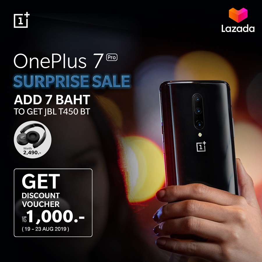 สามารถสั่งซื้อหรือดูรายละเอียดเพิ่มเติมคลิก https://bit.ly/2X4nZR6 และโปรโมชันที่ Lazada พบกับ Surprise Sale เมื่อซื้อ OnePlus 7 Pro รุ่นใดก็ได้ เพิ่มเงินแค่ 7 บาท รับฟรี! หูฟัง JBL T450 BT มูลค่า 2,490 บาท ตั้งแต่วันนี้ถึง 23 สิงหาคมนี้เท่านั้น สามารถสั่งซื้อได้ตามลิ้งค์นี้ https://bit.ly/2TtRXNk