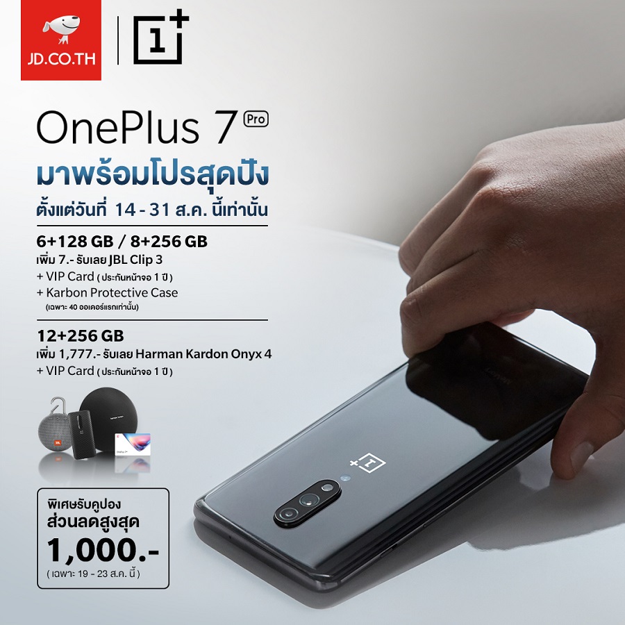 - เมื่อสั่งซื้อ OnePlus 7 Pro รุ่น 6+128 GB หรือ รุ่น 8+256 GB เพิ่มเงินเพียงแค่ 7 บาท รับลำโพง JBL Clip 3 และ VIP Card (ประกันหน้าจอ 1 ปี) พร้อมเคส Karbon Protective (เฉพาะ 40 ออเดอร์แรกเท่านั้น)
