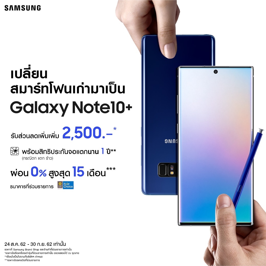 พิเศษ! ซัมซุงส่งโปรโมชั่นเก่าแลกใหม่ รับส่วนลดเพิ่มสูงสุด 2,500 บาท เมื่อนำโทรศัพท์มือถือเครื่องเก่ารุ่นใดยี่ห้อใดก็ได้ มาแลกซื้อ กาแลคซี่ โน้ต 10 พลัส ตั้งแต่วันที่ 24 สิงหาคม และ กาแลคซี่ โน้ต 10 ตั้งแต่วันที่ 1 กันยายนเป็นต้นไป ที่ซัมซุงแบรนด์ช็อปและร้านค้าที่ร่วมรายการ ถึงวันที่ 30 กันยายน 2562 เท่านั้น สามารถตรวจสอบรายละเอียดโปรโมชั่นเพิ่มเติมได้ที่จุดขาย หรือเว็ปไซต์ http://www.samsung.com/th/note10/specialoffer