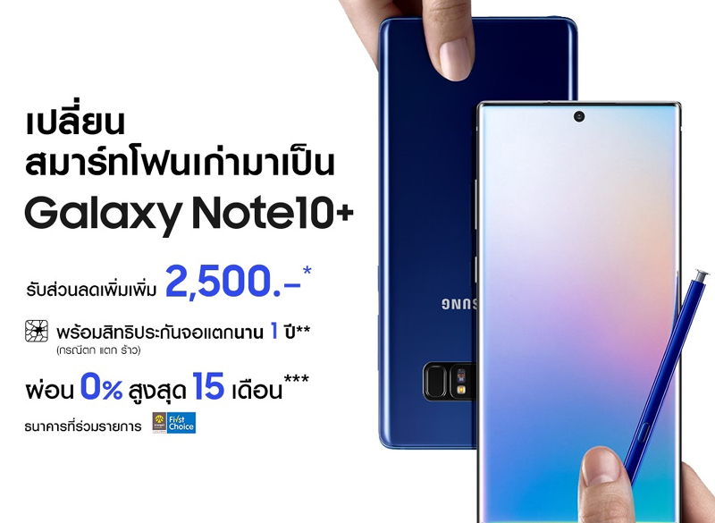 พิเศษ! ซัมซุงส่งโปรโมชั่นเก่าแลกใหม่ รับส่วนลดเพิ่มสูงสุด 2,500 บาท เมื่อนำโทรศัพท์มือถือเครื่องเก่ารุ่นใดยี่ห้อใดก็ได้ มาแลกซื้อ กาแลคซี่ โน้ต 10 พลัส ตั้งแต่วันที่ 24 สิงหาคม และ กาแลคซี่ โน้ต 10 ตั้งแต่วันที่ 1 กันยายนเป็นต้นไป ที่ซัมซุงแบรนด์ช็อปและร้านค้าที่ร่วมรายการ ถึงวันที่ 30 กันยายน 2562 เท่านั้น สามารถตรวจสอบรายละเอียดโปรโมชั่นเพิ่มเติมได้ที่จุดขาย หรือเว็ปไซต์ http://www.samsung.com/th/note10/specialoffer