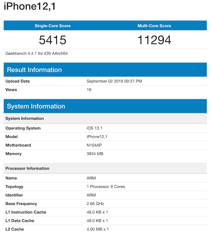 ทั้งนี้ล่าสุดเว็บไซต์ macrumors ได้นำเสนอข้อมูลที่อ้างว่าเป็นส่วนของคะแนน Geekbench ของ iPhone รุ่นใหม่ออกมา ซึ่งข้อมูลดังกล่าวใช้ชื่อว่าโมเดล 12,1 พอบอกเราได้ว่ารุ่นใหม่จะมาพร้อม RAM 4GB และด้วยชิป A13 ตัวใหม่ และสามารถทำคะแนน Geekbench ออกมาได้สูงคือคะแนน Single-Core อยู่ที่ 5415 คะแนน และ Multi-Core อยู่ที่ 11294 คะแนน