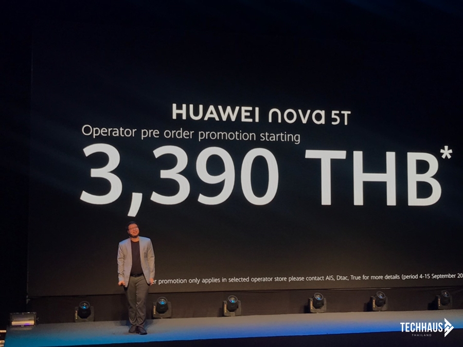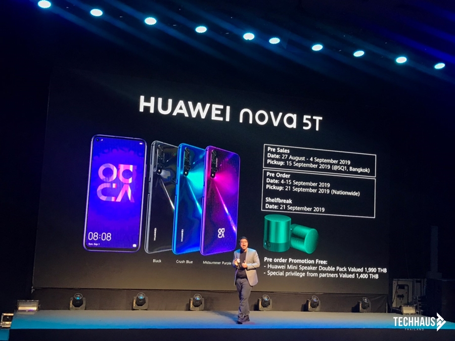 HUAWEI nova 5T จะวางจำหน่าย 3 สี ได้แก่ Crush Blue, Black และสีสุดพิเศษ ลิมิเต็ด เอดิชั่น Midsummer Purple ในราคาสุดเร้าใจเพียง 10,990 บาท โดยจะวางจำหน่ายอย่างเป็นทางการตั้งแต่ วันที่ 21 กันยายนนี้เป็นต้นไป โดยลูกค้าทั่วไปที่ Pre-order ในระหว่างวันที่ 4-15 กันยายน จะได้รับของสมนาคุณพิเศษ HUAWEI Mini Speaker มูลค่า 1,990 บาท ส่วนลูกค้าที่ Pre-order ผ่านผู้ให้บริการเครือข่าย AIS, dtac, True จะได้รับส่วนลดดังนี้