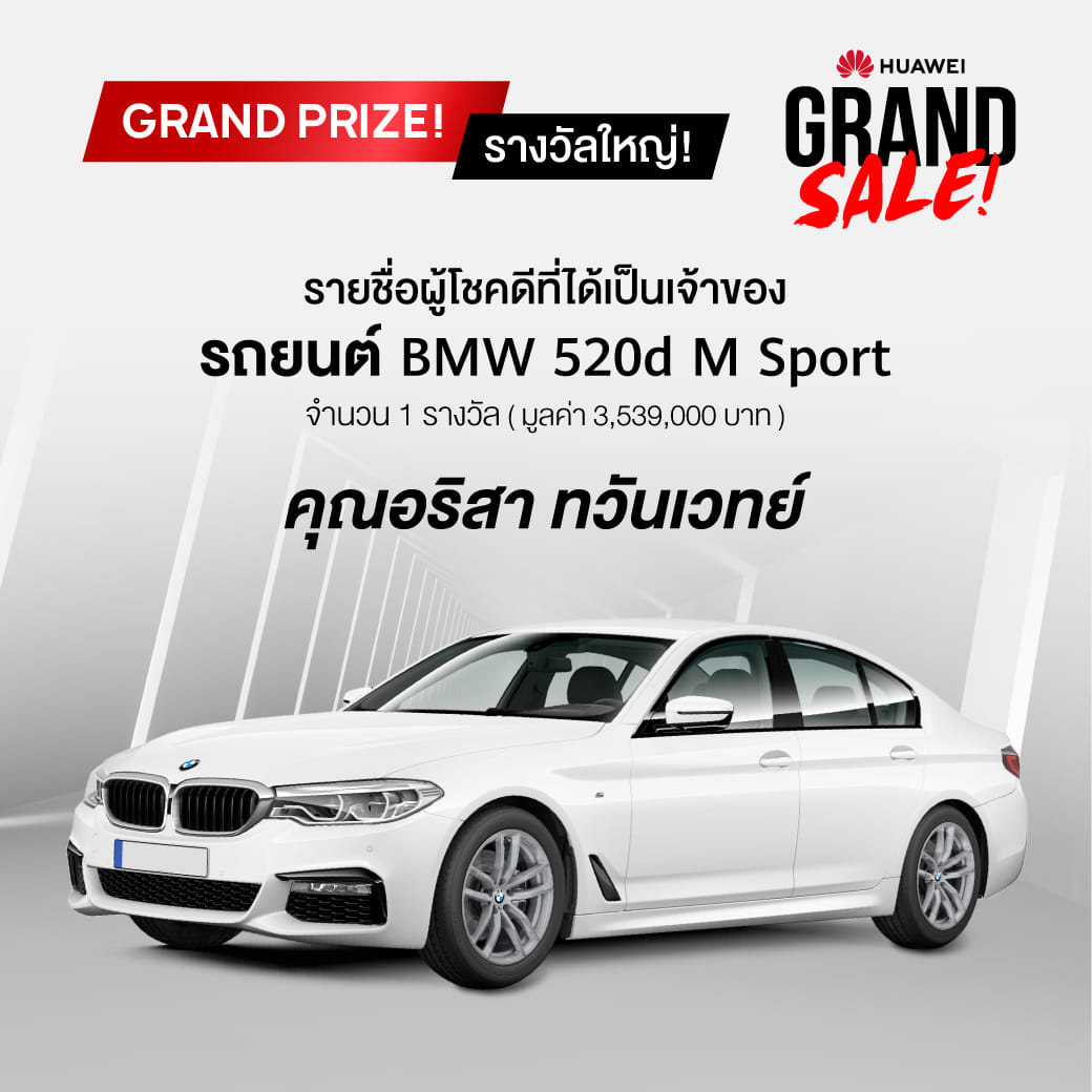 มร.อิงมาร์ หวาง ผู้อำนวยการ หัวเว่ย คอนซูมเมอร์ บิสสิเนส กรุ๊ป ประเทศไทย มอบรางวัลรถยนต์ BMW 520d M Sport มูลค่า 3.5 ล้านบาทให้แก่ คุณอริสา ทวันเวทย์ ผู้โชคดีที่ได้รับรางวัลใหญ่ จากแคมเปญ “HUAWEI Grand Sale 2019” HUAWEI Grand Sale 2019 โปรโมชั่นแห่งปีที่ดีที่สุดจากหัวเว่ย ซึ่งในปีนี้จัดหนักจัดเต็มกว่าเดิม