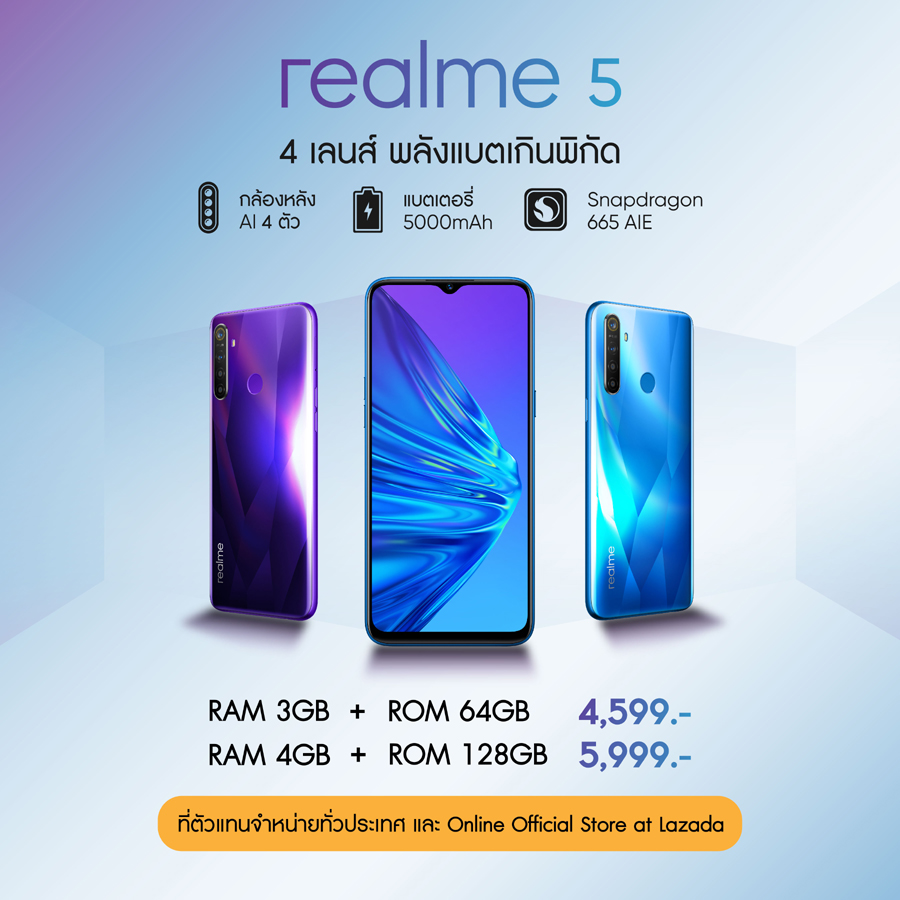 ล่าสุด realme เตรียมปล่อย realme 5 ลงสู่ตลาดทั่วประเทศแล้วทั้งสองความจุด้วยกัน 3+64 GB ในราคา 4,599 บาท และ 4+128 GB ในราคา 5,999 บาท