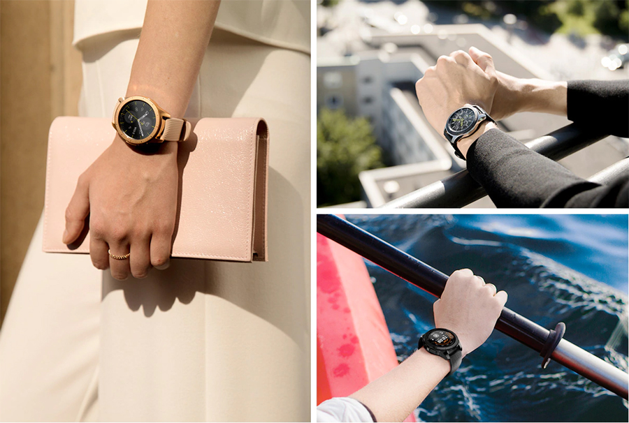 สำหรับ Samsung Galaxy Watch มีขนาดให้เลือกทั้ง 42 มิลลิเมตร (มีหน้าจอขนาด 1.2 นิ้ว) และมี 2 สีให้เลือกทั้งสีดำ และสี Rose Gold ส่วน 46 มิลลิเมตร (มีหน้าจอขนาด 1.3 นิ้ว) มีให้เลือกแค่สีดำเพียงสีเดียวและตกแต่งเหมือนกับ Samsung Gear S3