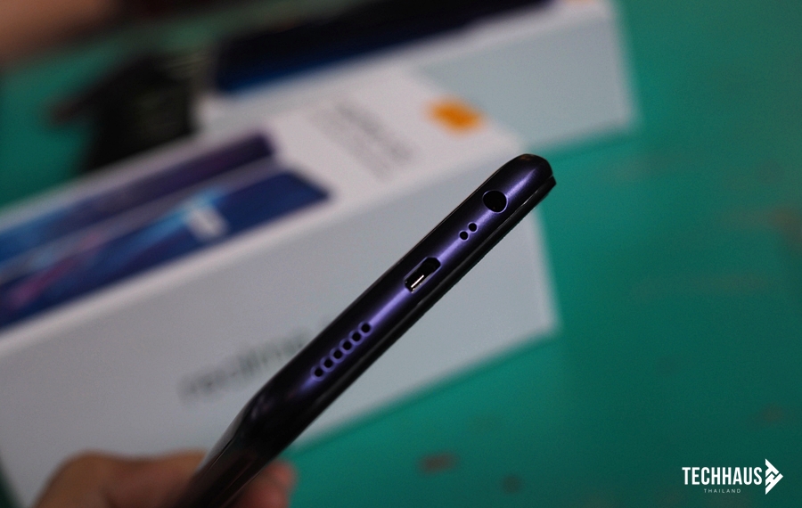 ด้านล่างตัวเครื่องเป็นส่วนขอช่องหูฟัง 3.5 มิลลิเมตร พร้อมไมค์สำหรับการตัดเสียงรบกวน, พอร์ตเชื่อมต่อ Micro USB และลำโพงเสียงภายนอก