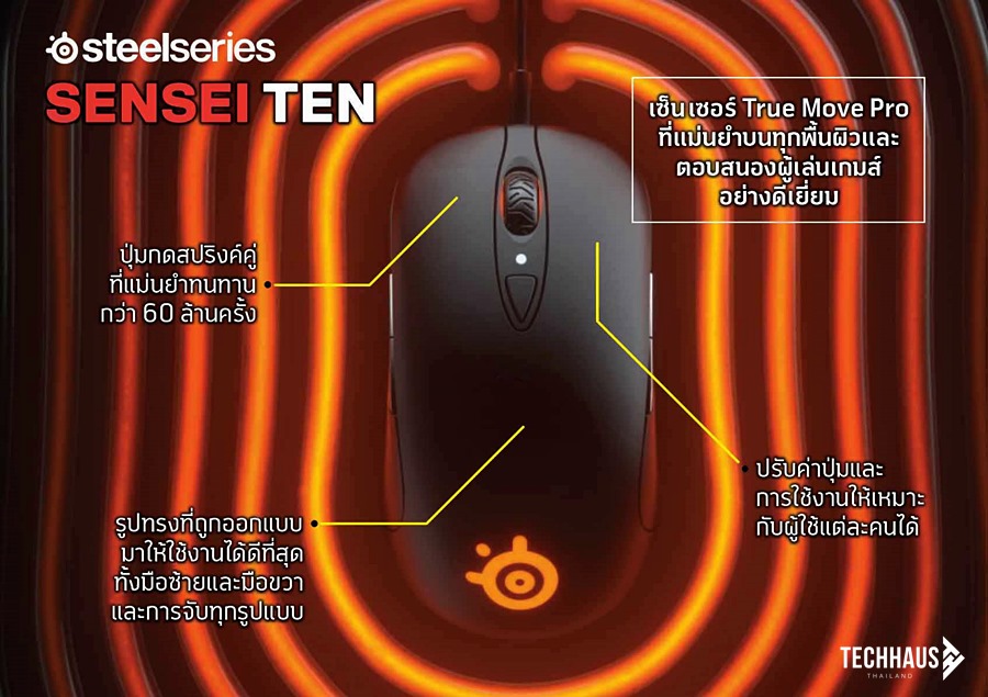 ขณะที่เมาส์ Sensei Ten ทำมาฉลองครบรอบ 10 ปี ของดีไซน์ที่โดดเด่นเป็นเอกลักษณ์แบบ Sensei ซึ่งเป็นที่ยอมรับ และชื่นชอบของนักแข่งเกมทั่วโลก เพราะมีจุดเด่นอยู่ที่ความเรียบง่าย แต่แฝงไว้ด้วยปุ่มกดแปดปุ่มที่ได้รับการออกแบบตามหลักสรีระของอุ้งมือตามมาตรฐานสากลเพื่อการจับที่ถนัดมือทุกรูปแบบ และเพิ่มรวดเร็วในการควบคุมยิ่งขึ้น ทั้งยังรองรับการใช้งานได้ทั้ง 2 มือ และครั้งนี้ Sensei Ten มีการพัฒนารูปทรงจากรุ่นก่อนๆ ซึ่งมาพร้อมกับเซ็นเซอร์แบบ eSport ใหม่ล่าสุดที่ชื่อว่า TrueMove Pro