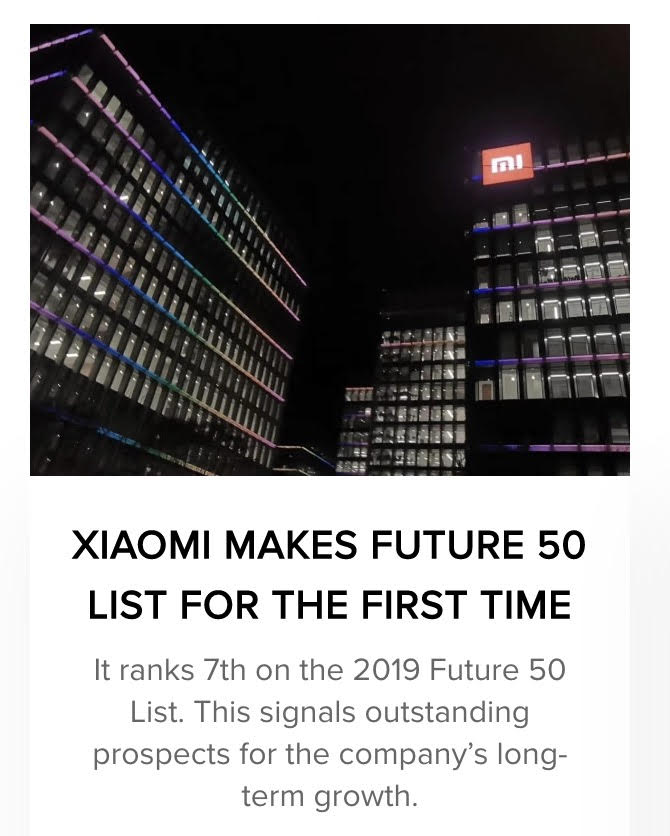 เสียวหมี่คอร์ปอเรชั่น ได้ทำสถิติใหม่ติดโผบริษัทดาวรุ่งแห่งอนาคตโดยการติด ท็อป 50 ของปี 2019 ในการจัดอันดับ Future 50 List เป็นครั้งแรก และมาแรงเป็นอันดับที่ 7 แสดงให้เห็นถึงความสำเร็จอย่างต่อเนื่องของบริษัทพร้อมด้วยกลยุทธ์อันชาญฉลาด การจัดอันดับนี้ถูกจัดทำขึ้นโดยบริษัทให้คำปรึกษาระดับโลกอย่าง Boston Consulting Group และ นิตยสาร Fortune ตั้งแต่ปี 2017