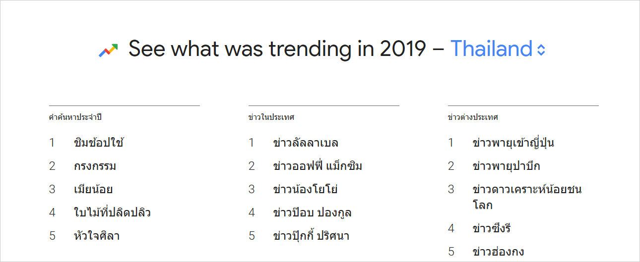 สำหรับปีนี้นั้งคำที่มาแรงมากที่สุดคงหนีไม่พ้นคำว่า “ชิมช้อปใช้” ซึ่งกลายมาเป็นเป็นคำค้นหายอดนิยม Google ประเทศไทย ประจำปี 2019 ในส่วนของข่าวในเมืองไทยประจำปี 2019 ที่คนให้ความสนใจมากที่สุดคือ “ข่าวลัลลาเบล”