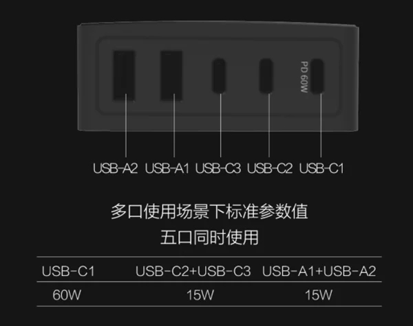 จุดเด่นของปลั๊กรุ่นนี้มีช่องเสียบ USB พร้อมกันทั้งหมด 5 ช่อง รองรับการชาร์จไฟได้ครบทั้ง เครื่องเล่น MP3, เครื่องเล่นเกมม, มือถือ, Tablet ไปจนถึง Notebook กันเลยทีเดียว มาพร้อมกับ USB-C ที่มีกำลังสูงสุด 60W แยกออกแบบอิสระ, ส่วนสาย USB-C อีก 2 ช่องจะให้กำลังสูงสุด 18W นอกจากนี้ยังมี USB ปกติ มาให้ หากเสียบอุปกรณ์พร้อมกันอาจจะมีการลดกำลังไฟลงนิดหน่อย