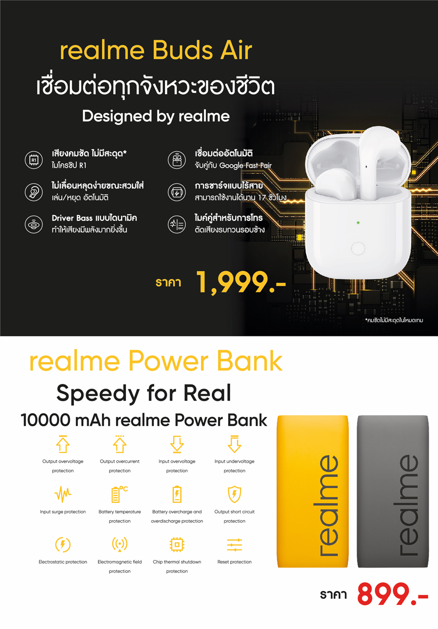 นอกจากสมาร์ทโฟนที่ realme ยกขบวนมาจัดโปรโมชั่นอย่างสุดคุ้มแล้ว ยังมีผลิตภัณฑ์ที่น่าสนใจอย่างอีกมากมาย อย่างหูฟังไร้สายรุ่นล่าสุด realme Buds Air ตัวจริงการเชื่อมต่อแบบไร้สาย ตอบโจทย์สำหรับใครที่กำลังมองหาหูฟังไร้สายที่อัดแน่นไปด้วยคุณภาพห้ามพลาด ในราคาเพียง 1,999 บาท และ realme Power Bank Speedy for Real มาพร้อมความจุ 10000 mAh ในราคาเพียง 899 บาท