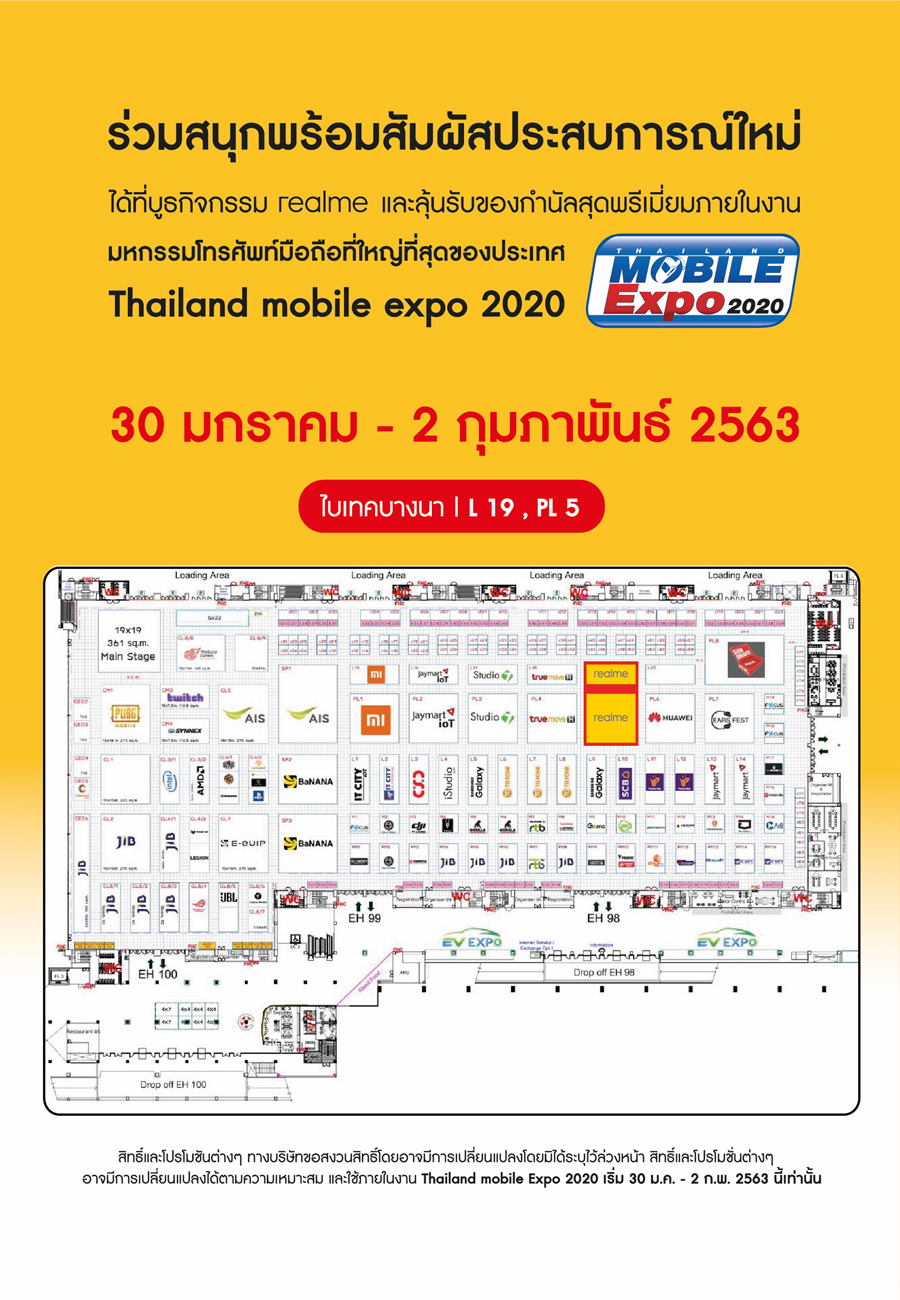 **ห้ามพลาด! มาร่วมสนุกพร้อมเปิดประสบการณ์ใหม่กับ realme ได้ในงาน Thailand Mobile Expo 2020 วันที่ 30 ม.ค. – 2 ก.พ. 63 ณ ไบเทคบางนา ที่บูธ realme L19-PL5 ตั้งแต่เวลา 10.00 น. เป็นต้นไป ติดตามข้อมูลเพิ่มได้ที่ https://www.facebook.com/realmeTH