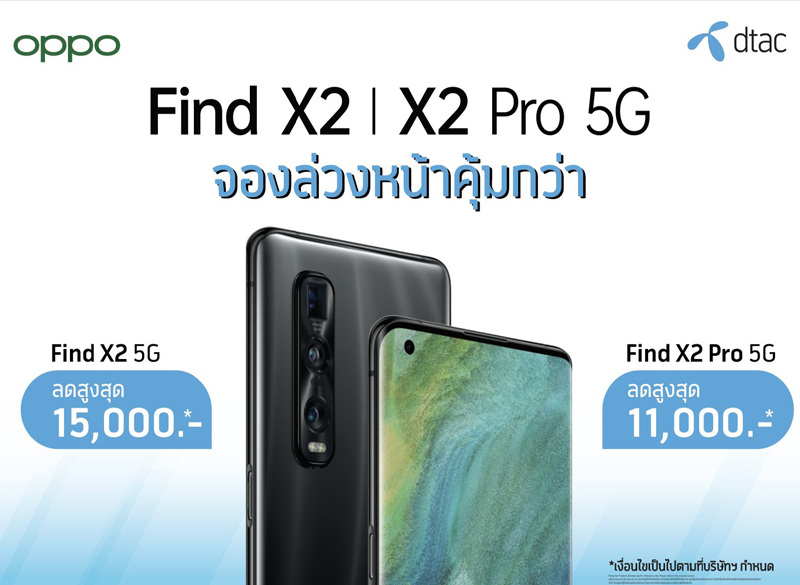 พบกับข้อเสนอพิเศษจากดีแทค มอบส่วนลดสูงสุดถึง 13,000 บาท ราคาเริ่มเพียง 20,990 บาท สำหรับลูกค้า ดีแทค แพลตตินั่มบลูเมมเบอร์ (Platinum Blue Member) รับส่วนลดค่าเครื่องเพิ่ม 2,000 บาท เหลือเพียง 18,990 บาท เมื่อสั่งซื้อ OPPO Find X2 5G ล่วงหน้า และรับส่วนลดสูงสุดถึง 9,000 บาท ราคาเริ่มเพียง 31,990 บาท สำหรับลูกค้าดีแทค แพลตตินั่มบลูเมมเบอร์ (Platinum Blue Member) รับส่วนลดค่าเครื่องเพิ่ม 2,000 บาท เหลือเพียง 29,990 บาท เมื่อสั่งซื้อ OPPO Find X2 Pro 5G ล่วงหน้าและสำหรับลูกค้าดีแทคที่มีอายุการใช้งาน 12 เดือนขึ้นไป ไม่ต้องชำระค่าบริการล่วงหน้า ลูกค้าย้ายค่ายเบอร์เดิม รับส่วนลดเพิ่มได้อีก 1,500 บาทพิเศษสุด! ลูกค้าสามารถผ่อน 0% นานสูงสุด 36 เดือน ได้ที่สำนักงานดีแทค โดยรายละเอียดเป็นไปตามที่บริษัทฯกำหนด นอกจากนี้ลูกค้าที่ทำการสั่ง