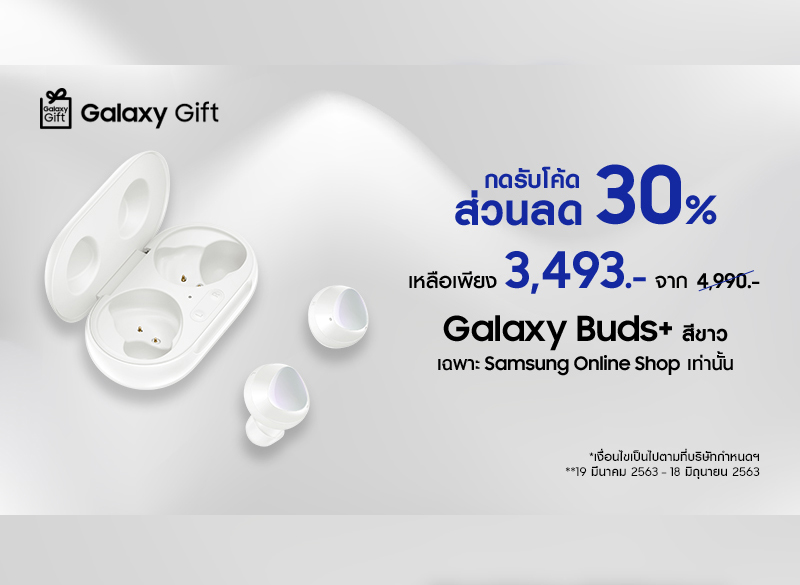 เพื่อซื้อ Galaxy Buds+ ผ่านทางเว็บไซต์ https://shop.samsung.com/th/Products/Mobile/Wearable/Galaxy-Buds/Galaxy-Buds%2B/p/SM-R175NZWAASA