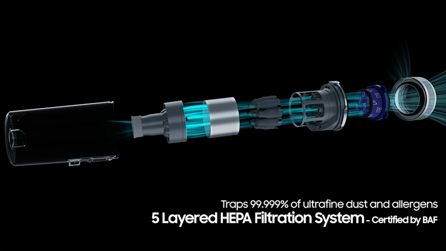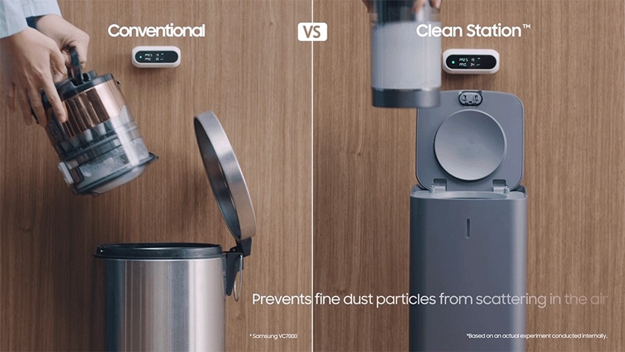 นอกจากนี้เครื่อง Clean Station™ ของ Samsung Jet™ ยังถูกออกแบบมาให้มีดีไซน์ที่ปิดสนิท ช่วยป้องกันไม่ให้ฝุ่นละเอียดกระจายกลับสู่อากาศขณะทำความสะอาดกล่องดักฝุ่น และเครื่องยังทำงานร่วมกับระบบการกรอง HEPA 5 ชั้น ที่สะอาดกว่าการทำความสะอาดกล่องเก็บฝุ่นแบบทั่ว ๆ ไปถึง 400 เท่า