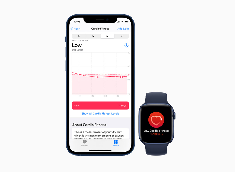 iOS 14.3 และ watchOS 7.2 ช่วยให้ผู้ใช้ Apple Watch สามารถดูระดับฟิตเนสแบบคาร์ดิโอของตนเองในแอพสุขภาพบน iPhone และรับการแจ้งเตือนบน Apple Watch ได้ หากค่าที่วัดได้นั้นต่ำกว่าเกณฑ์ ผู้ใช้ Apple Watch สามารถวัดระดับฟิตเนสแบบคาร์ดิโอที่ต่ำกว่าเกณฑ์ได้อย่างง่ายดายด้วยเทคโนโลยีสุดล้ำที่อยู่เบื้องหลัง watchOS 7 ทั้งยังรับการแจ้งเตือนฟิตเนสแบบคาร์ดิโอซึ่งจะช่วยกระตุ้นให้พวกเขาแอ็คทีฟยิ่งขึ้น เพื่อผลลัพธ์ต่อสุขภาพที่ดียิ่งขึ้นในระยะยาว