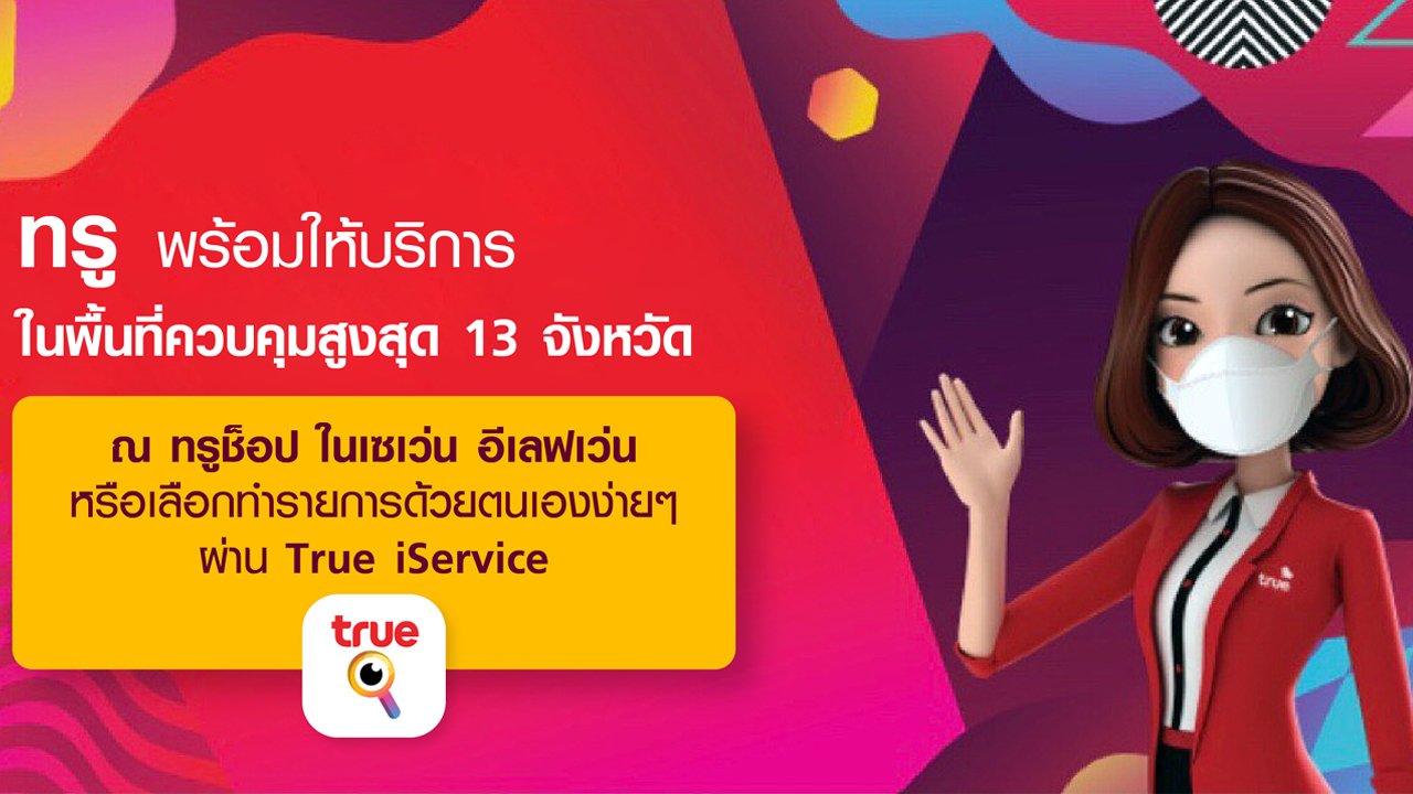 เพื่อลดการแพร่ระบาดของเชื้อโควิด-19 ในพื้นที่ควบคุมสูงสุด 13 จังหวัด ในช่วงปิดให้บริการ ทรูช็อปในห้างสรรพสินค้า ทรู อำนวยความสะดวก ให้บริการอย่างต่อเนื่องผ่านช่องทางอื่นๆ อาทิ ทรูช็อปในเซเว่น อีเลฟเว่น หรือเลือกทำรายการด้วยตนเองง่ายๆ ผ่านแอปพลิเคชันและเว็บไซต์ True iService