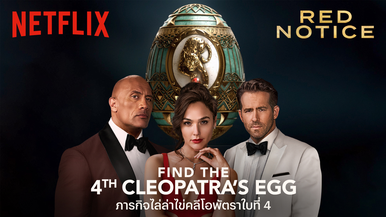 Red Notice คือ ภาพยนตร์แอ็คชั่นไล่ล่าข้ามโลก แบบที่ไม่รู้ว่าใครจะจับใคร เริ่มฉายเมื่อวันที่ 12 พฤศจิกายนนี้ ทาง Netflix และความสนุกของการเดินทางผจญภัยที่ถ่ายทอดผ่านตัวละครหลักทั้งสาม ปลุกกระแสความเป็นนักล่าสมบัติล้ำค่าในตัวแฟน ๆ Netflix จึงตอบสนองด้วยกิจกรรม “ไล่ล่าไข่คลีโอพัตรา ใบที่ 4” ที่ต้องประลองไหวพริบกันแบบ Virtual Hunt!