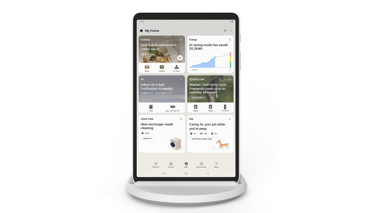 การทำอาหารจะง่ายขึ้นเพราะ SmartThings Cooking จะช่วยคุณค้นหาเมนู ซื้อวัตถุดิบ และเตรียมการทำอาหาร อย่างง่ายดายทุกสัปดาห์ ผ่านหน้าจอบนตู้เย็น Family Hub (แฟมิลี่ ฮับ) เมื่อถึงเวลาต้องซักผ้า SmartThings Clothing Care จะเชื่อมต่อกับดีไวซ์อย่าง เครื่องซักผ้าและเครื่องอบผ้า Bespoke รวมถึง Bespoke AirDresser (แอร์เดรสเซอร์) เพื่อแนะนำวิธีการซักที่ดีที่สุดสำหรับชนิดของผ้าที่ต้องการทำความสะอาด และยังอ้างอิงคำแนะนำจากรูปแบบการใช้งานและฤดูกาลอีกด้วย นอกจากนี้ SmartThings Pet จะช่วยให้คุณสามารถดูแลสัตว์เลี้ยงของคุณได้ด้วยกล้องอัจฉริยะในเครื่องดูดฝุ่น Bespoke Jet Bot™ AI+ ที่สามารถเชื่อมต่อกับเครืองปรับอากาศเพื่อปรับอุณหภูมิให้เหมาะสมอยู่เสมอ