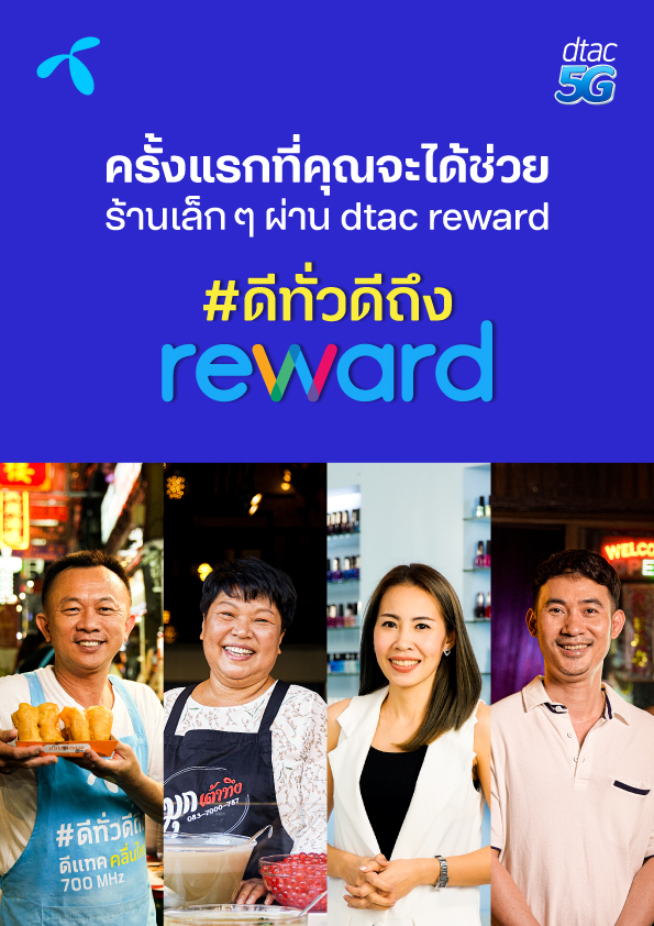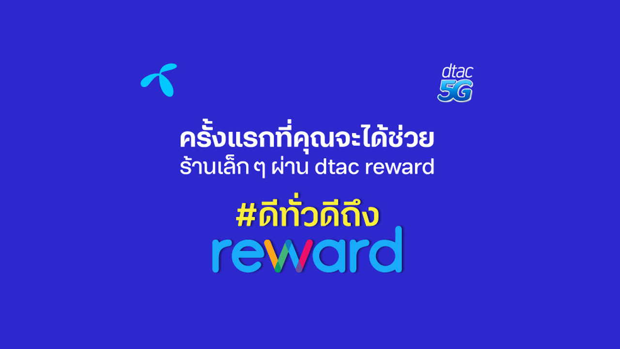 ดีแทคขอร่วมเป็นหนึ่งแรงผลักดันให้ ร้านค้าเล็ก ๆ ได้กลับมายิ้ม กลับมาฟื้นตัวได้เร็วที่สุด จากแคมเปญ #ดีทั่วดีถึง reward ได้เล่าเรื่องราว ความน่ารักของร้านค้า ผ่านวิดีโอ ออนไลน์ ประชาสัมพันธ์ให้ทุกคนได้รู้จัก และชวนกันมาอุดหนุนร้านเล็ก ๆ เพื่อให้พวกเขากลับมาฟื้นตัวได้เร็วที่สุด