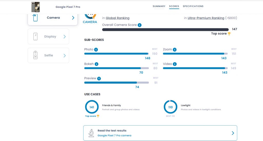 เรียกได้ว่าเป็นการกลับมาครอบอันดับ 1 ภายหลังจาก Pixel 2 ทำได้เมื่อนานมาแล้ว จุดที่ทำให้คะแนนของ Pixel 7 Pro ทำได้ดีคือเรื่องของการถ่ายภาพและวิดีโอที่ทำคะแนนได้สูงเมื่อเทียบกับมือถือระดับเดียวกัน โดยเฉพาะการถ่ายภาพบุคคลเป็นแบบกลุ่ม ที่มีสีผิวที่ตรงจากฟีเจอร์ Real Tone และยังมีการทำงานกับการถ่ายภาพเคลื่อนไหวได้ดีไม่มีอาการเบลอแต่อย่างใด