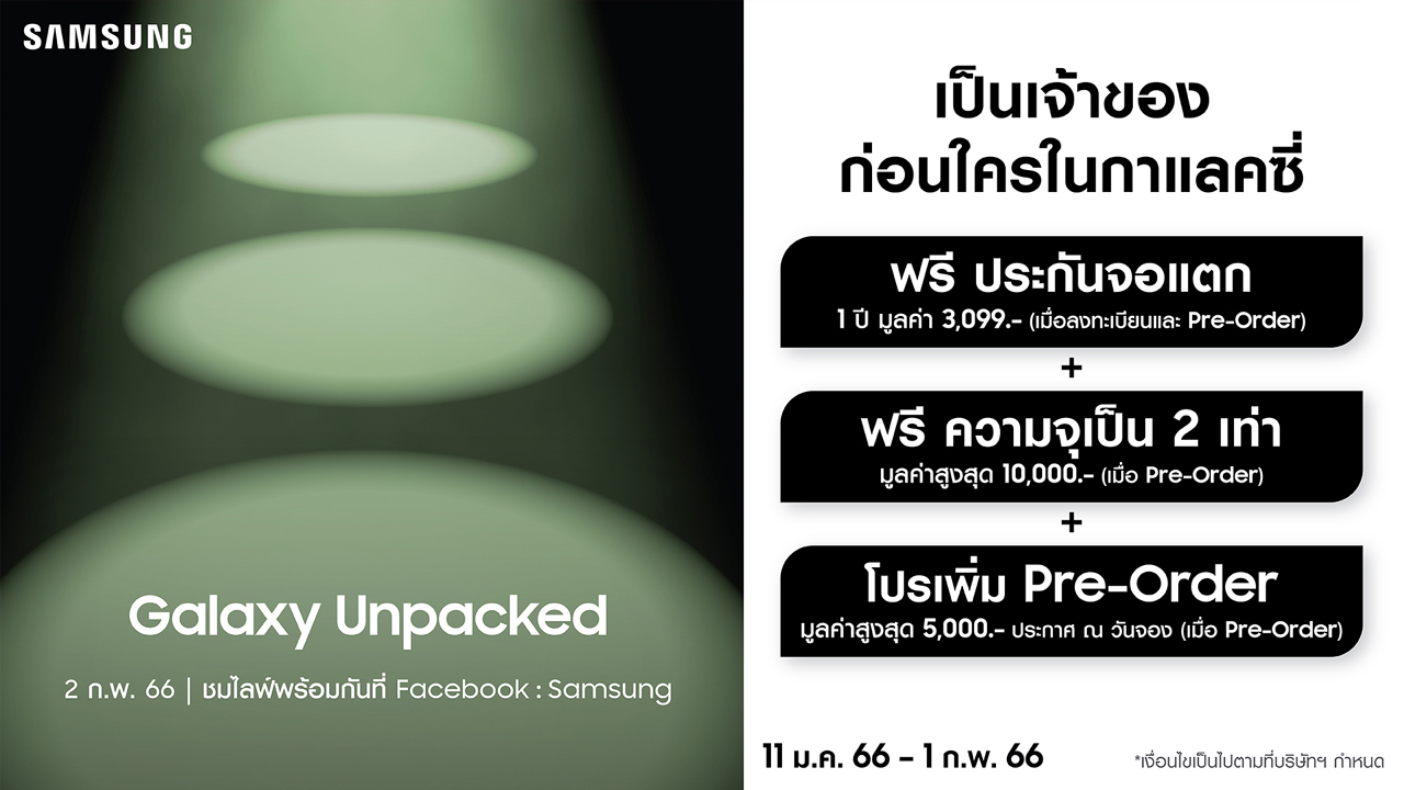 ซัมซุงมีกำหนดเปิดตัวผลิตภัณฑ์ใหม่ของปี 2023 ภายในงาน Galaxy Unpacked ที่ทุกคนต่างรอคอย และซัมซุงได้เปิดลงทะเบียนความสนใจ The new Galaxy ล่วงหน้า ในครั้งนี้เฉพาะผู้ที่ลงทะเบียนรับสิทธิ์เท่านั้นจะได้รับ The new Galaxy ก่อนใคร เป็นเจ้าของและได้ใช้เป็นกลุ่มแรกของโลก