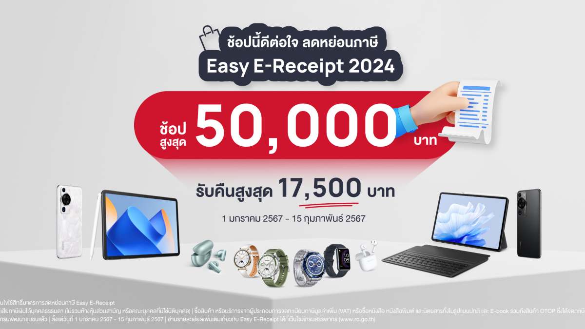 นอกจากนี้ผลิตภัณฑ์หัวเว่ยยังเข้าร่วมโครงการ “Easy E-Receipt 2024” ช้อปสูงสุด 50,000 บาท รับคืนสูงสุด 17.500 บาท