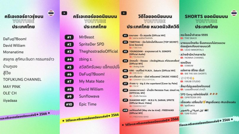 YouTube สรุปเทรนด์คอนเทนต์ที่คนไทยนิยมรับชมในปี 2566 ประกาศผลวิดีโอที่ได้รับความนิยมสูงสุดและครีเอเตอร์ยอดนิยมแห่งปี