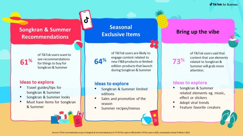 ผยข้อมูลเชิงลึกเกี่ยวกับตลาดและผู้บริโภคสำหรับเทศกาลสงกรานต์และซัมเมอร์ประจำปี 2567 ที่กำลังจะมาถึง โดยมีเป้าหมายเพื่อขับเคลื่อนผลลัพธ์ทางธุรกิจของแบรนด์ต่างๆ ให้ได้มากยิ่งขึ้นในช่วงฤดูกาลที่สดใสนี้ ซึ่ง TikTok ได้นำเสนอข้อมูลเชิงลึกที่เน้นการใช้ประโยชน์จากความบันเทิงเพื่อขับเคลื่อนการเติบโต ผ่านเนื้อหาที่ให้ความสนุกสนานเป็นหลักและสร้างผลลัพธ์ได้อย่างสร้างสรรค์ในวงกว้าง ช่วยส่งเสริมให้แบรนด์สามารถมีส่วนร่วมกับผู้บริโภคได้มากยิ่งขึ้น