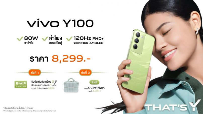 vivo Y100 พร้อมให้ vivo fans ชาวไทยเป็นเจ้าของได้แล้ววันนี้กับรุ่นความจุ 8GB + 256GB ในราคา 8,299 บาท รับสิทธิ์ก่อนใคร สำหรับผู้ที่สั่งซื้อตั้งแต่วันนี้ – 30 มิถุนายน 2567 จะได้รับของแถมสุดพิเศษ อย่าง V-friend luggage case ขนาด 14 นิ้ว มูลค่า 2,499 บาท (ของมีจำนวนจำกัด) และ E-VIP Card มูลค่า 5,999 บาท รับประกันตัวเครื่องเพิ่มเป็น 2 ปี และประกันหน้าจอแตก 1 ครั้ง ภายใน 2 ปีแรก