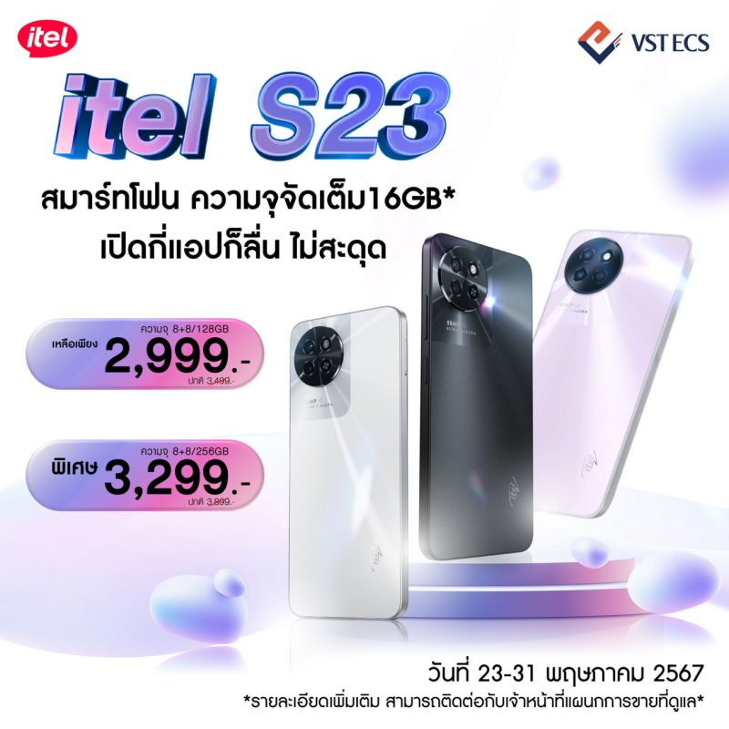 คุณสมศักดิ์ เพ็ชรทวีพรเดช ประธานเจ้าหน้าที่บริหาร บริษัท วีเอสที อีซีเอส (ประเทศไทย) จำกัด กล่าวว่า “ไอเทล (itel) คือสมาร์ทโฟนคุณภาพที่เราได้คัดสรร เข้ามาจัดจำหน่ายในประเทศไทย ที่ได้รับการตอบรับที่ดีจากผู้ใช้งาน รวมไปถึงพาร์ทเนอร์ทั่วประเทศกว่า 5,500 ร้านค้า ล่าสุดจัดโปรโมชันกระตุ้นยอดขาย สมาร์ทโฟน itel รุ่น S23 วางจำหน่ายทั้งหมด 2 ความจุ ได้แก่ 128/8+8GB ลดเหลือราคา 2,999 บาท จากปกติ 3,499 บาท และ 256/8+8GB ลดเหลือราคา 3,299 บาท จากปกติ 3,899 บาท