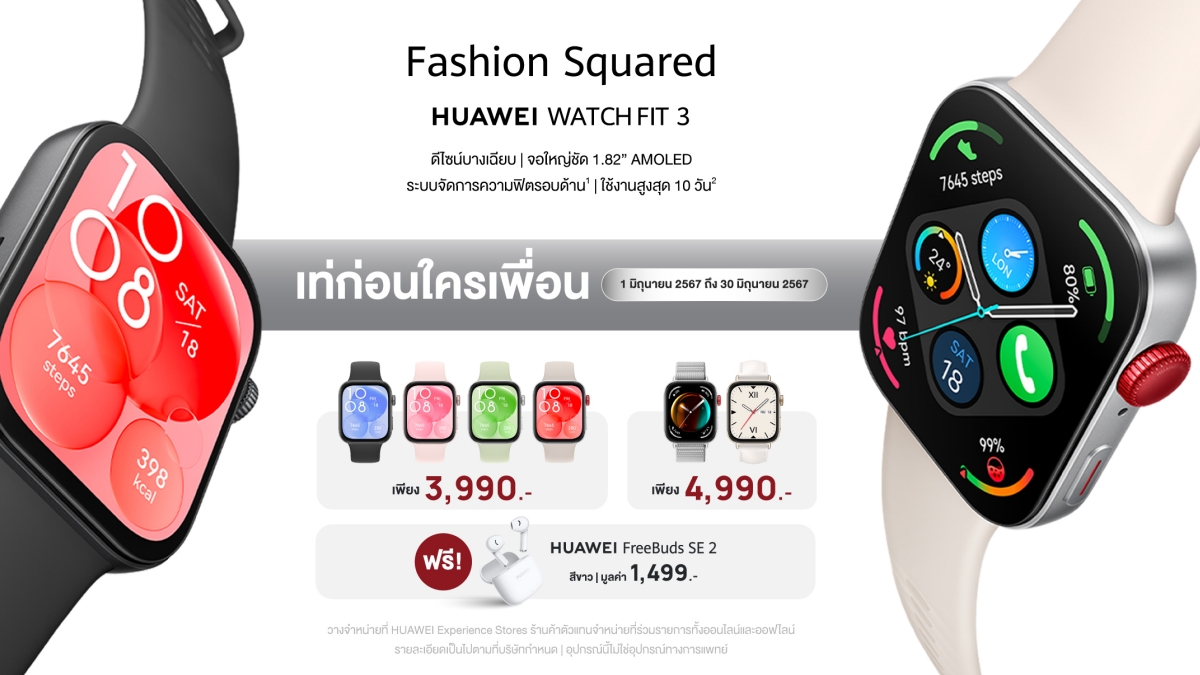 HUAWEI WATCH FIT 3 มีให้เลือก 6 สี ได้แก่ สีดำ, สีชมพู, สีเขียว, สีขาว วางจำหน่ายในราคา 3,990 บาท และสีเทา สายไนลอน และ สีขาว สายหนัง วางจำหน่ายในราคา 4,990 บาท พร้อมรับฟรี HUAWEI FreeBuds SE 2 สีขาว มูลค่า 1,499 บาท โปรโมชันตั้งแต่ 1 มิถุนายน 2567 ถึง 30 มิถุนายน 2567 เป็นเจ้าของได้ที่ HUAWEI Experience Store ตัวแทนจำหน่ายที่ร่วมรายการ และร้านค้าอย่างเป็นทางการของหัวเว่ยบน Lazada, Shopee และ TikTok