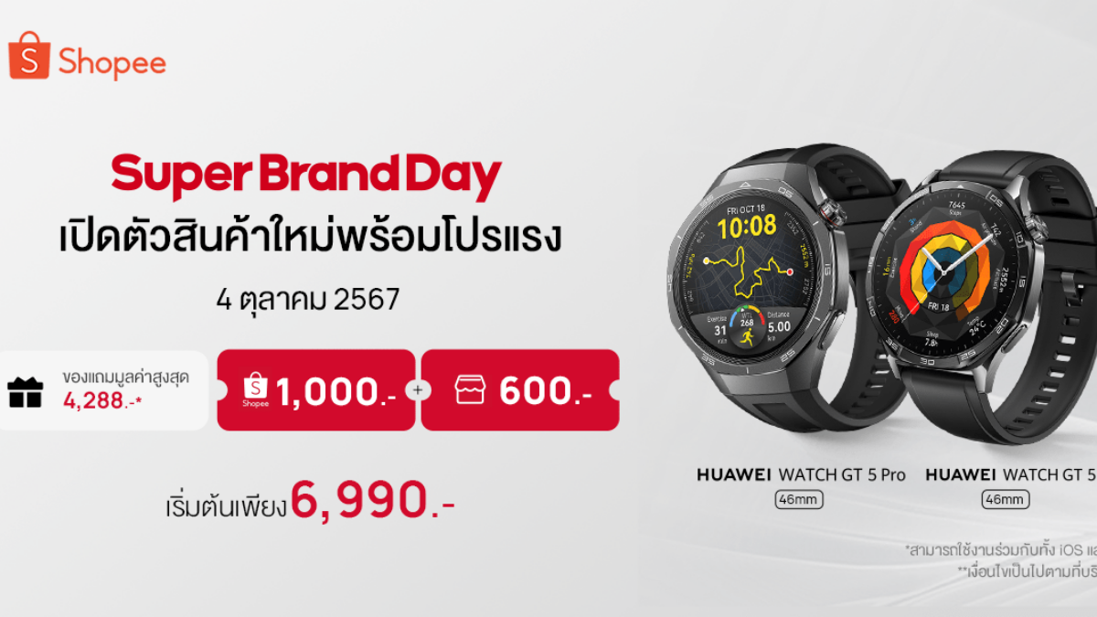 หัวเว่ย เตรียมเปิดตัวสมาร์ทวอชรุ่นล่าสุด HUAWEI WATCH GT 5 Series พร้อมจัดแคมเปญ Super Brand Day บน Shopee ในวันที่ 4 ตุลาคม 2567 โดยมีราคาเริ่มต้นเพียง 6,990 บาท พร้อมส่วนลดและของแถมมูลค่าสูงสุดกว่า 5,800 บาท