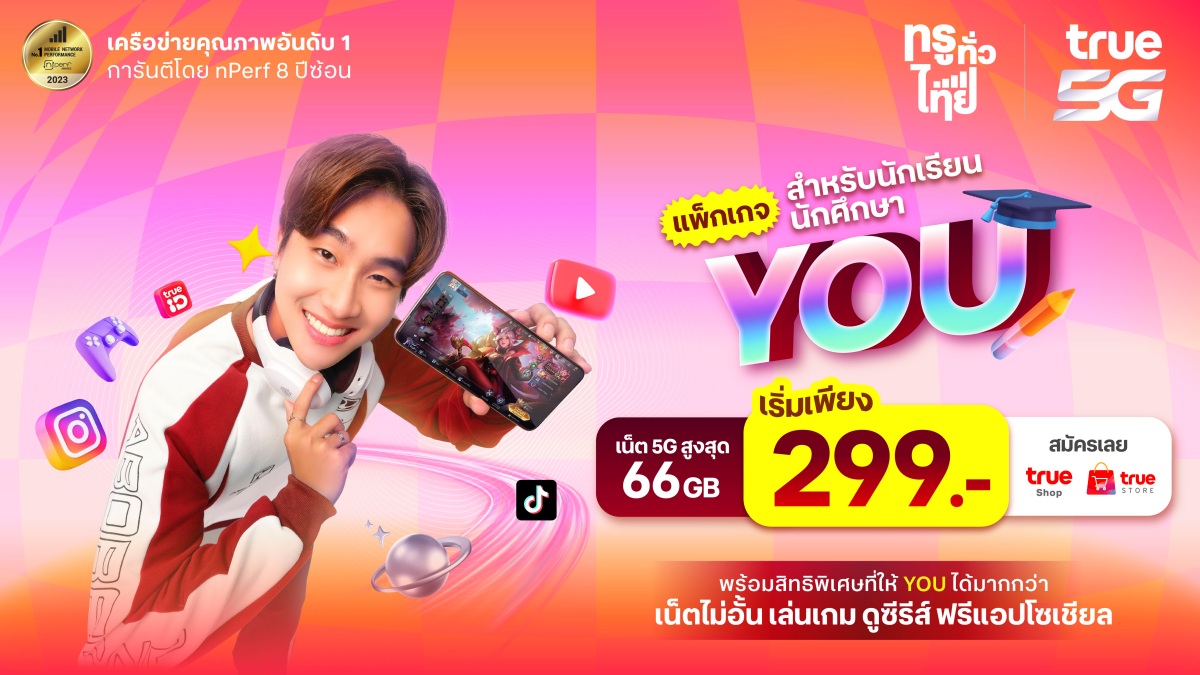 สำหรับลูกค้า Gen Z (อายุ 7-24 ปี) ทรู ดีแทค มีข้อเสนอพิเศษกับแพ็กเกจ YOU แบบรายเดือน เริ่มต้นเพียง 299 บาท รับเน็ต 5G สูงสุด 66GB พร้อมรับ “แฟนต้า” แดงมะนาว ฟรีที่ 7-Eleven ทุกเดือน ส่วนลูกค้าแบบเติมเงิน เพียงสมัคร YOU Student club และมียอดสมัครแพ็กเสริมสะสมเกิน 199 บาทต่อเดือน รับสิทธิ์ซื้อ “แฟนต้า” แดงมะนาว 1 แถม 1 ที่ 7-Eleven หรือ Lotus’s ทั่วประเทศ